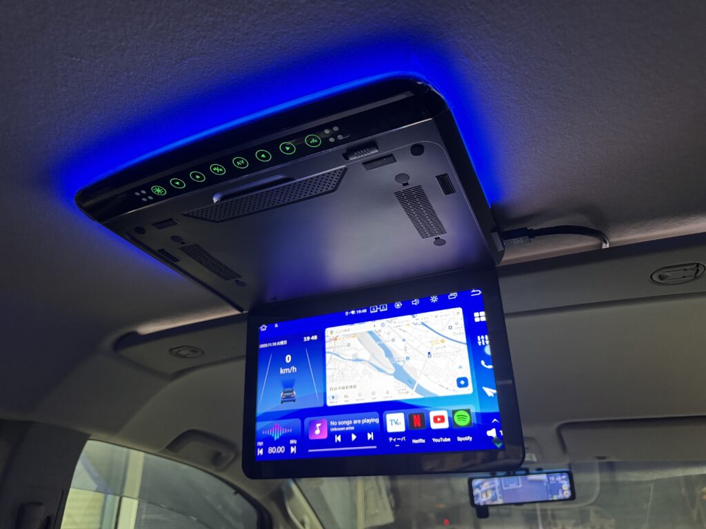 動作としては前とフロントを同じ画面を映すミラーリングモードと、前で別々の画面を映すモードができるみたいです。音声もミラーリングモードは車両から。前後別々モードの時は車両はナビの音声で、リヤはフリップダウンモニター内蔵のスピーカーで楽しむ形になりそう。この辺は国産カーナビであれば車両の音声を前後別々にできたりするので軍配が上がります。