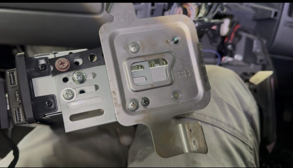 PRA109は国産のカーナビと違い、本体取付用のネジ穴位置が日本車のDIN規格のネジ穴位置を全く考慮していません笑 さらにデリカD5の初期型はナビの位置が奥まっているため、PRA109のネジ穴位置では本体の前だしが足りず、モニターがパネルに当たってしまうため、本体を金具などを追加して前に出す加工が必須になります。